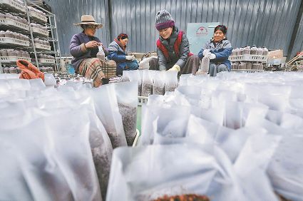 還有村民進了產(chǎn)業(yè)園務(wù)工。帕他志瑪、扎西翁姆、白瑪、確志、斯郎卓呷都在產(chǎn)業(yè)園務(wù)工,月平均收入可達3000元以上。在八角樓鄉(xiāng),像帕他志瑪這樣在“家門口”打工、全家人掙錢的當(dāng)?shù)卮迕窦彝ゲ辉谏贁?shù)。40多位村民在產(chǎn)業(yè)園長期就業(yè),100多位村民參與產(chǎn)業(yè)園的季節(jié)性就業(yè),這都帶動了松茸村、木澤西村、維地村的貧困群眾實現(xiàn)高質(zhì)量脫貧?,F(xiàn)代立體高效食用菌產(chǎn)業(yè)的建立讓當(dāng)?shù)卮迕竦谝淮螄L到了一天掙上百塊錢的甜頭。