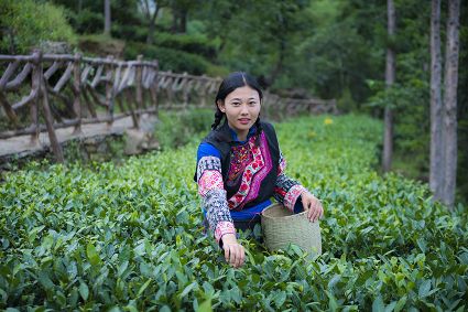 待日上三竿,陽(yáng)光斜射穿越云霧,采茶姑娘身著客家服,藍(lán)黑格調(diào),綴以手繪圖紋,頭戴角形斗笠。嫣然而笑。瞬間清潤(rùn)心間,討一捧新茶至云上茶居,沏茶邀友。