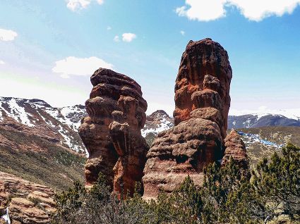 新龍紅山丹霞主要發(fā)育以丹霞石柱、峰叢、方山、石墻、石洞、崖壁等以及各種造型石為主的地貌特征,遠遠望去,雄偉壯觀、千姿百態(tài)。因大部分山峰高出雪線,受冰川作用影響顯著,北坡河谷部分有常年片狀積雪覆蓋。