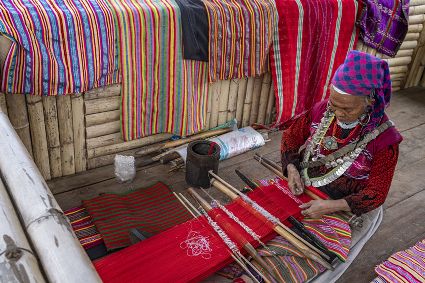 今年72歲的本央老人,是僜人服飾制作技藝西藏自治區(qū)級非遺傳承人。在西藏林芝市察隅縣沙瓊村,老人身著傳統(tǒng)的僜人服飾,在自家的涼亭里編織布料。