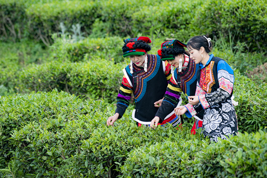 三五成群,戴笠攜籃。茶田之間,普米漢子,