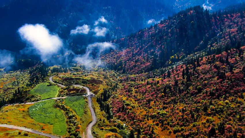 時光不語,偷施魔法,大自然手持五彩的紅、黃、藍、綠、白調(diào)色盤,將道孚的秋天潑灑成童話的世界。