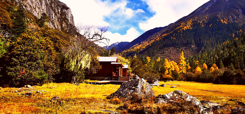 站在山谷放眼展望,金黃的草甸、蜿蜒透亮的小河、參天古木、悠閑啃草的牦牛,點綴其間的幾棟藏房,這一切構(gòu)成一個幽靜而神奇的世界。步入其間,就像走進一個奇麗而孤寂的世外仙境以及純凈空氣的薈萃之地。置身其中,心曠神怡,仿佛自己是走在一幅渾然天成的美麗畫卷之中。