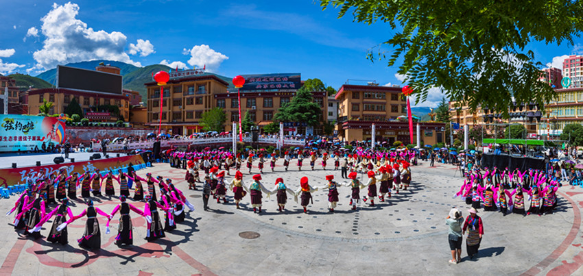 金弦子廣場,舞者們仿若守護(hù)者一般,圍著金黃色的弦子雕塑,或輕歌曼舞或昂揚(yáng)踏步,斑斕的畢旺、搖曳的流蘇和飄逸的紅袖與花共舞,與景相映,聲聲吟唱、步步踏尋,是追憶更是誓言。