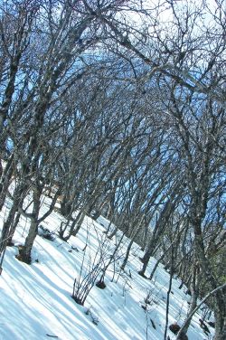 接下來,就是在馬鞍山頂?shù)难┑厣先鲆?、照相?br />    在馬鞍山頂?shù)谋泵婕氨逼?,有一片望不到邊際的樹林。冬天的這片樹林,呈成熟而貴氣的暗褐色,葉落枝出,紛亂、素凈、蕭瑟、清貴。于是,以雪地和樹林作背景,也照了不少相。