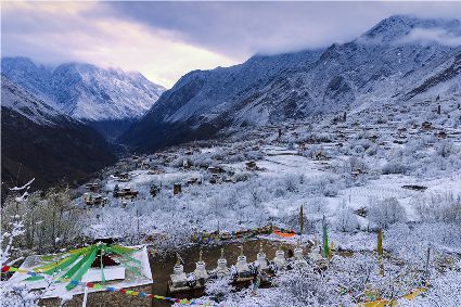突然,耳畔傳來(lái)了誦經(jīng)聲。山坡下的平臺(tái)上,是一排白塔。白塔的周圍,掛滿了經(jīng)幡。早起的誦經(jīng)人,沿著中路藏寨的小路來(lái)到白塔,一邊轉(zhuǎn)白塔,一邊虔誠(chéng)誦經(jīng)。一年四季的地區(qū)稱春雨貴如油,那么旱雨兩季的地區(qū)該怎么贊美春雪呢?怕是該稱為春雪貴如金了。祈愿吧——一年好時(shí)節(jié),又是一個(gè)豐收年!