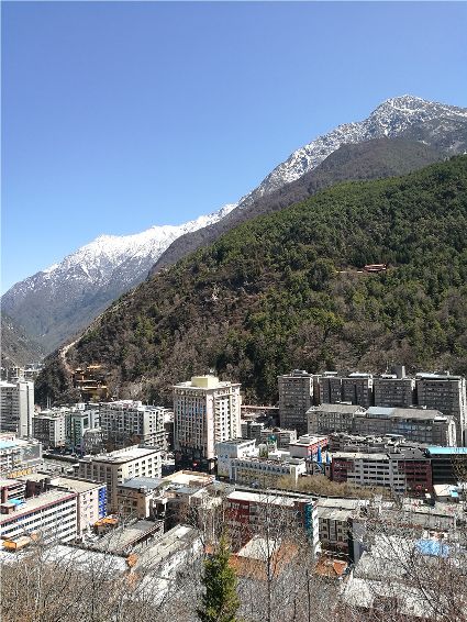 天空像剛被浸染的綢緞,蔚藍的主色已經(jīng)略顯;白雪好似從浸染的綢緞上滴落下的顏料與其它顏色的混合,眷戀的駐足在山尖,在其耳旁傾訴來年的約定;一顆顆萬年青穩(wěn)穩(wěn)的站立,將山中的寺廟、亭閣緊緊地包圍,見證著康定四季輪回的變化;依然披著秋冬贈予黃色外衣的樹木,拋開桎梏,堅守在一座座樓房旁。藍與白,黃與綠……這大美的晴天為人們帶來了別樣的視覺盛宴。