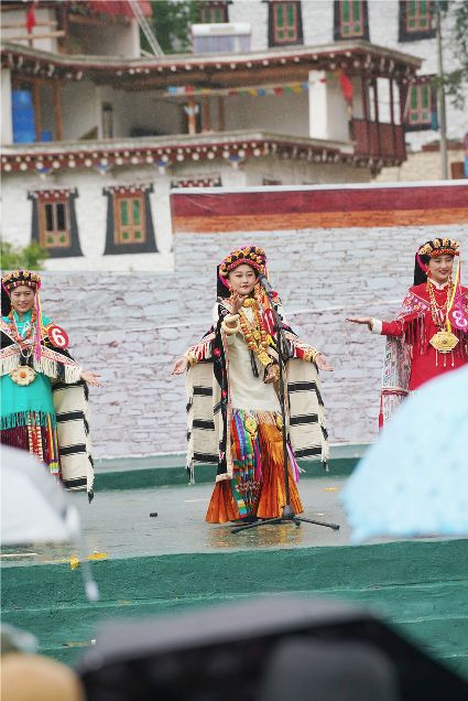 比賽開始不久,現(xiàn)場下起了小雨,但絲毫沒有影響熱烈氣氛。臺(tái)上的佳麗們,略施粉黛,穿著承載著嘉絨風(fēng)情文化的民族盛裝,自我介紹,優(yōu)雅展示。臺(tái)下,則是鄉(xiāng)民齊聚,熱情高漲。大家紛紛到場,為佳麗們加油助威。據(jù)介紹,丹巴出美女始于漢代的東女國時(shí)期。古時(shí)每年農(nóng)作物收獲的時(shí)節(jié),丹巴各村各寨都要舉行盛大的選美和祭祀活動(dòng)。