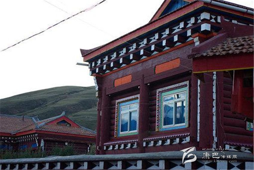 道孚民居的一般結(jié)構(gòu)是以藏式木架穿逗,作為整體骨架,一般為二、三層;以片石或泥土砌墻,按正方形各邊7-10尺為空間立柱,四柱之間稱一空,一般房屋有16-30空,也有40、50空的。柱與柱之間有穿枋或原木鎖拉扯,其余維護(hù)結(jié)構(gòu)由橫向平置,圓弧朝外的對(duì)剖圓木組成,它們層層重疊、四角交叉相搭,房頂高約5至8米。比起改進(jìn)前,柱子直徑普遍加大,豪宅的柱子需兩人合圍,給人一種穩(wěn)重之感;底層和二層的木柱連體,并仿照內(nèi)地建筑的木穿逗式結(jié)構(gòu),梁柱接榫,形成一個(gè)牢固的整體,以增強(qiáng)抗震能力。外形多為四方形,二樓呈L形、凹形或回形,內(nèi)層結(jié)構(gòu)是純木材,架“棒柯”或“棒勒”,間隔為各種用途的房間。房間上裝木望板,下鋪木地板,頂蓋用樺樹皮或硬雜木條墊底再鋪“阿嘎土”,日曬雨淋絕不漏水。屋架門窗外表的裸露部分,則多以油漆或自制的有色土染過,既防腐防蛀,又美觀大方。從外部看,二層平臺(tái)的女兒墻上,種滿了各種花草,房前屋后還種植了果樹。用泥土夯筑的底層和二層后方的土墻刷成白色,而木質(zhì)的半圓木墻體涂成褐紅色,窗框和窗扇均作彩繪,室內(nèi)裝飾也都用紅色等“火熱”的基調(diào)。各種色彩相互協(xié)調(diào)映襯,給人的印象特別深刻。