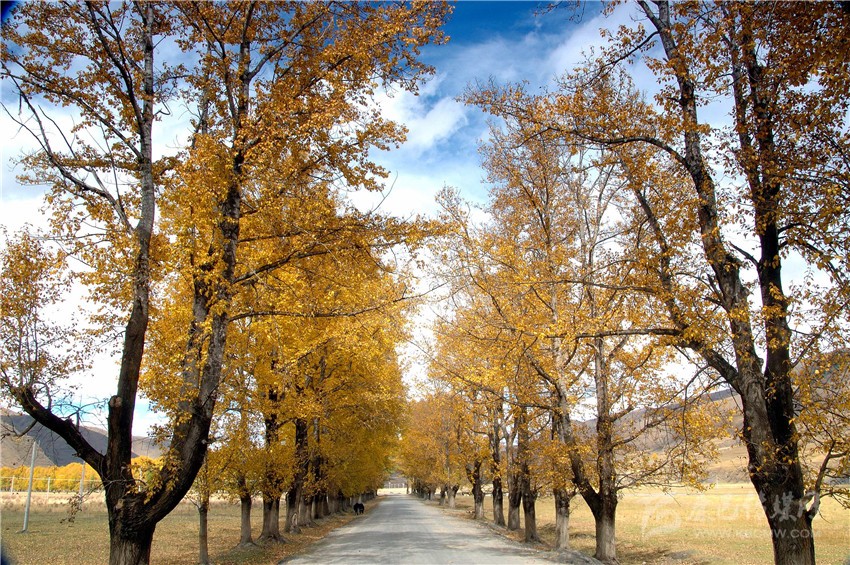 一條淺淺的小河與公路相依相偎地蜿蜒流淌,房前路旁一棵棵挺拔的白楊在秋風秋陽中炫耀著特有的金黃。遠處的山脊,舒緩地在天幕上劃出一道道優(yōu)美的弧線。滿眼藍色、白色、金黃、黑色、綠色的飽和色塊,在明麗的秋陽光線的描繪中,凸現(xiàn)著流暢的色彩和線條,恍如置身畫中。