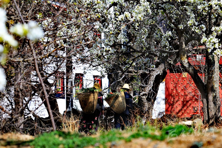 藏寨的梨花,并非成片的生長在一起,它們散落在村民的田間地頭和房前屋后,老干虬枝,滄桑感十足,仿佛是一個(gè)個(gè)“時(shí)間老人”,守望著藏寨的幸福變遷。