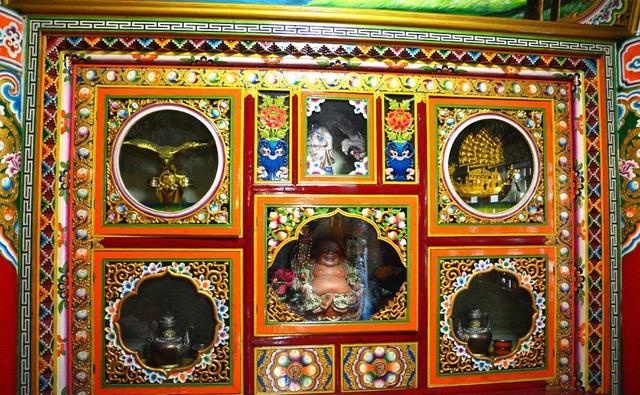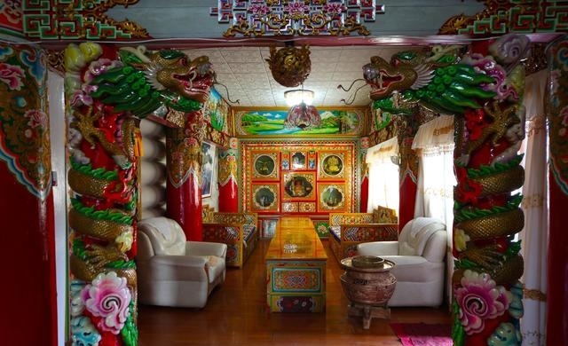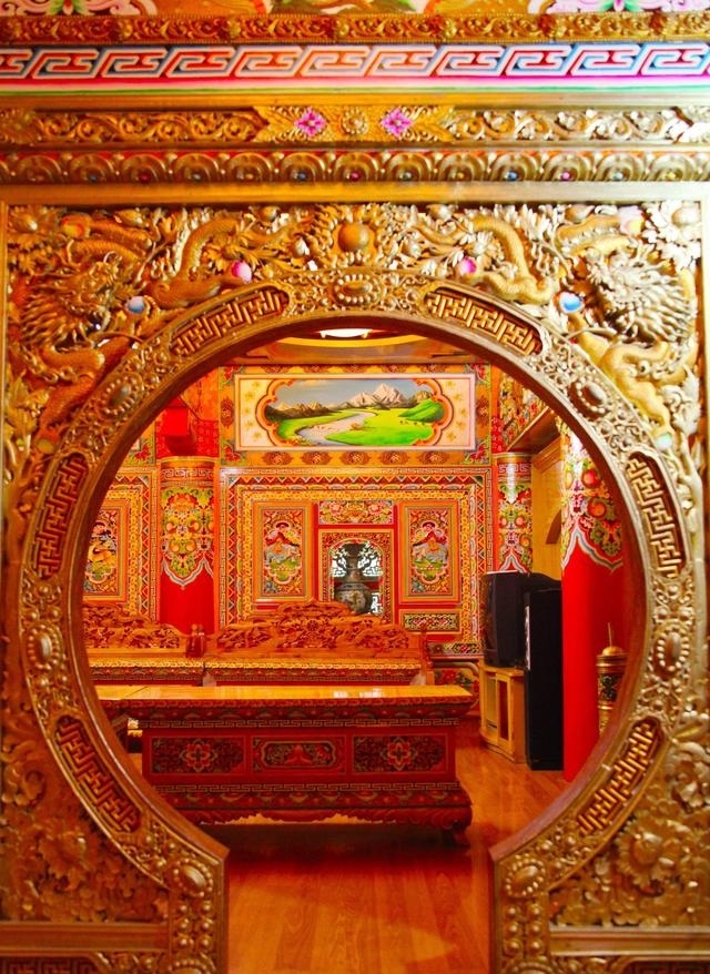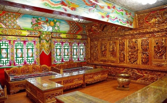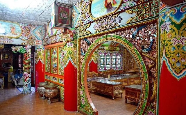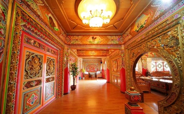 道孚民居室內(nèi)精雕細(xì)鏤,描金繪彩,每一個(gè)圖案或圖畫就是一個(gè)吉祥物或一個(gè)傳說。民居客廳陳設(shè)豪華,富麗堂皇,極顯主人的富有;經(jīng)堂供奉佛像,酥油燈長(zhǎng)明,是家中的清靜之地;臥室多用箱式或椅式藏床,陳設(shè)溫馨而別具風(fēng)情。