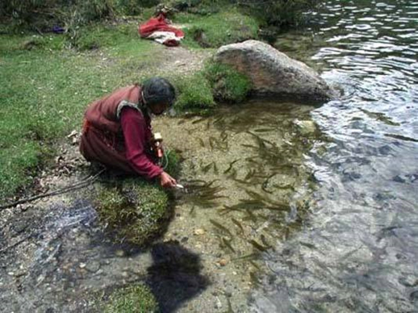 在湖邊的一塊平地上,有座被林莽掩映的廟宇,廟宇粉墻黛瓦,森嚴(yán)的大門銅環(huán)锃亮。棲息在原始森林中的藏馬雞與盤羊,跟寺院的喇嘛和尼姑建立了深厚的友情,相處得非常融洽。每年11月至來(lái)年5月,高山被茫茫大雪所覆蓋,大地披上了銀裝,這時(shí)候成群的動(dòng)物到低處覓食,寺院利用這個(gè)機(jī)會(huì),派人定時(shí)定點(diǎn)撒鹽巴和食物予以喂養(yǎng),漸漸使野生的動(dòng)物們不再怕穿紅色袈裟的人,到后來(lái)居然無(wú)所顧忌地進(jìn)入寺院覓食。