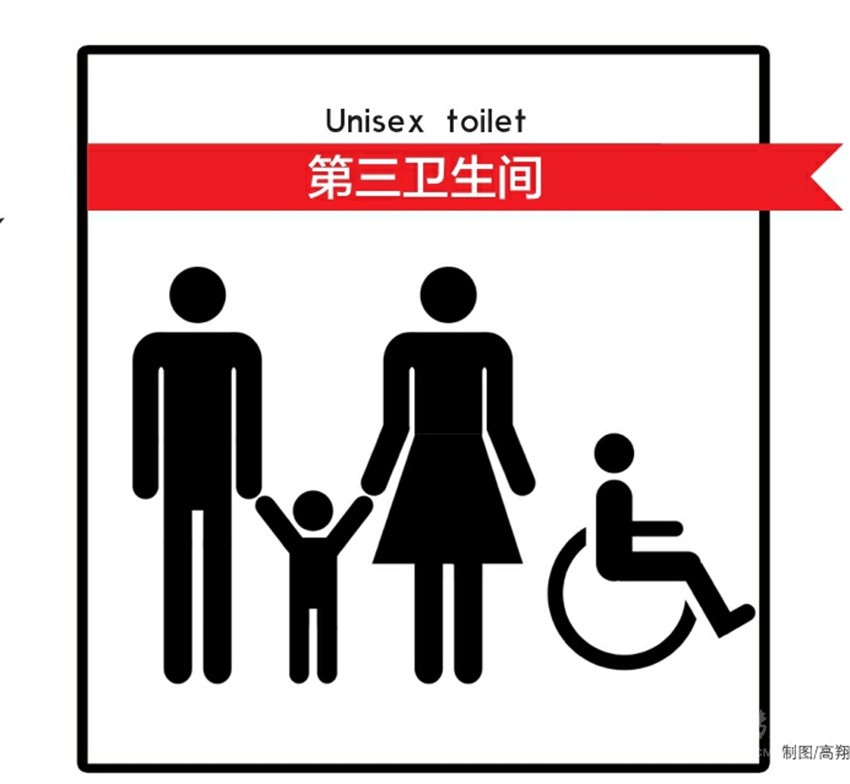 值得一提的是,四川的第三衛(wèi)生間還將有標示。《通知》顯示,該標示上畫著一對夫妻牽著孩子,旁邊還有一個坐著輪椅的行動不便者。在畫面下方,注明了“第三衛(wèi)生間”字樣,英文“Unisex toilet”意為“無性別廁所”。 (據(jù)四川在線)