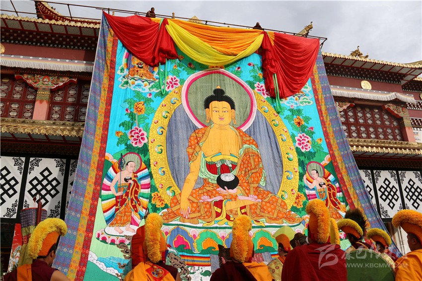 一大早,寺廟僧人身穿節(jié)日的盛裝,在莊嚴(yán)的鼓樂聲和誦經(jīng)聲中,僧眾們與廣大群眾仰望佛像,隨著黃綾的徐徐拉開,氣勢(shì)恢宏的巨幅佛像展現(xiàn)在眾人面前,預(yù)示人們平安吉祥,風(fēng)調(diào)雨順,安康幸福。