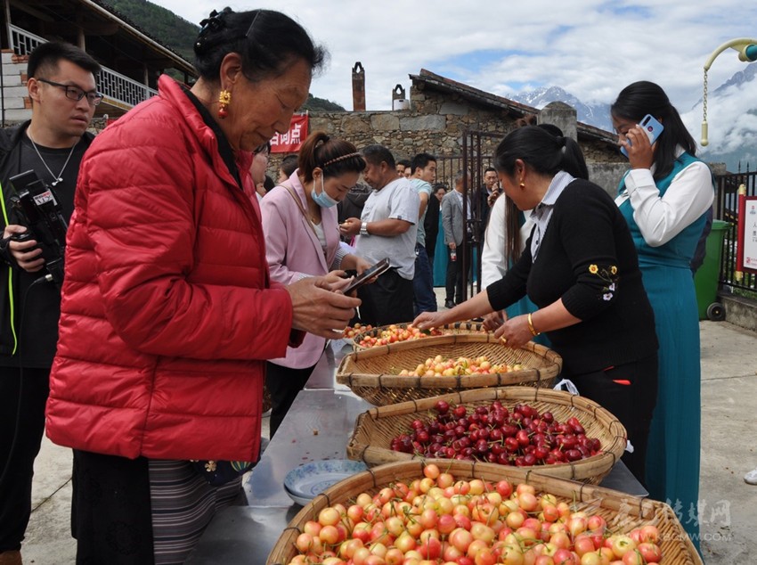 五月的大渡河沿岸鮮花怒放、瓜果飄香,黃橙橙的枇杷,紅彤彤的櫻桃沉甸甸地掛滿(mǎn)枝頭。近日,“鄉(xiāng)村振興·櫻你而美”康定市甜櫻桃采摘品鑒現(xiàn)場(chǎng)會(huì)在該市姑咱鎮(zhèn)莊上村舉行。拉賓斯、布魯克斯、美早、早紅珠、晚紅珠、紅燈、明珠等10多個(gè)品種大櫻桃均已成熟,各路客商紛紛與村合作社對(duì)接訂貨。