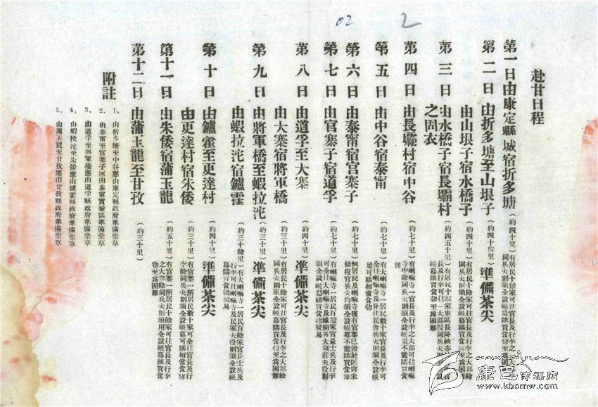 為了安排好戴院長一行的行程,西康建省委員會專門發(fā)出了一份“訓(xùn)令”。這份時間表就是根據(jù)“訓(xùn)令”要求為戴院長行程作出的安排。每天從何地到達何地,里程多少,休息地有無村莊、寺廟,接待力量如何、是進房屋休息還是支帳篷都有說明,而且對沿途各縣各地提出了包括應(yīng)準備柴草、應(yīng)在哪些地方準備“打尖茶”(午飯)等具體要求。