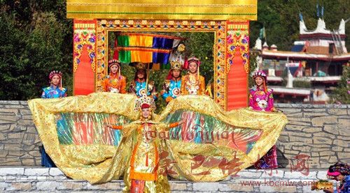 在催人奮進(jìn)的戰(zhàn)鼓聲中,一群身披甲胄的士兵拿著長(zhǎng)劍,背著巨弓走到臺(tái)前,在鏗鏘的戰(zhàn)鼓聲中,戰(zhàn)士們做著各種競(jìng)技動(dòng)作,模仿武士們互相攻擊的樣子,那矯健的身影展示了遠(yuǎn)古時(shí)代嘉絨藏族先民們?yōu)榱松媾c自然努力抗?fàn)幍膱?chǎng)景。過了一會(huì)兒音樂一轉(zhuǎn),戰(zhàn)鼓聲漸漸減弱,在鳥雀的陣陣啾啾聲中,一座木門慢慢的開啟,一位身披長(zhǎng)袍、頭戴鳳冠的女王在眾多美女的簇?fù)硐?,緩緩走下臺(tái)階步入舞臺(tái)中央,此時(shí),一位手捧托盤的老者來(lái)到女王面前單膝下跪,將托盤高舉過頂,并邀請(qǐng)女王品嘗佳肴,女王將中指在酒中蘸了蘸,并曲起中指向四周輕輕彈去,寓意愿將杯中美酒與四方百姓同飲。在女王面前還放置著一個(gè)凈水桶,桶中盛滿了清澈的甘泉,桶上橫放著一枝柏樹枝,女王伸出纖纖玉手,拿著柏樹枝在水中蘸了蘸,面向墨爾多神山撒去,寓意向神山祈福。這是此次《美人谷·丹巴》節(jié)目展演中的序曲部分,有著強(qiáng)烈的東女神韻,將遠(yuǎn)古時(shí)代東女國(guó)女王遺風(fēng)展演的淋漓盡致。
