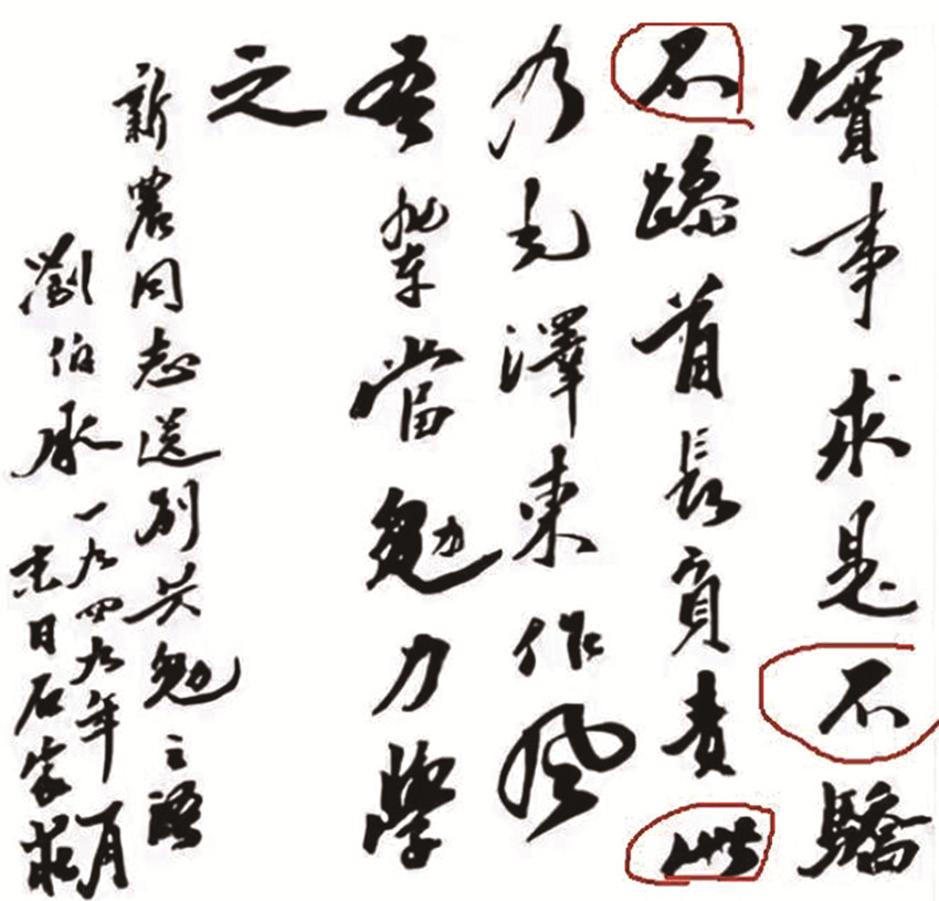 以上是劉帥1949年的書法,距離1936年13年的時間,“不” “此”二字,明顯與布告上的風(fēng)格一致。國、合、軍等單個的字,在建國后的書法作品與布告比較,都可以在劉帥其他書法中看到明顯出自一人。