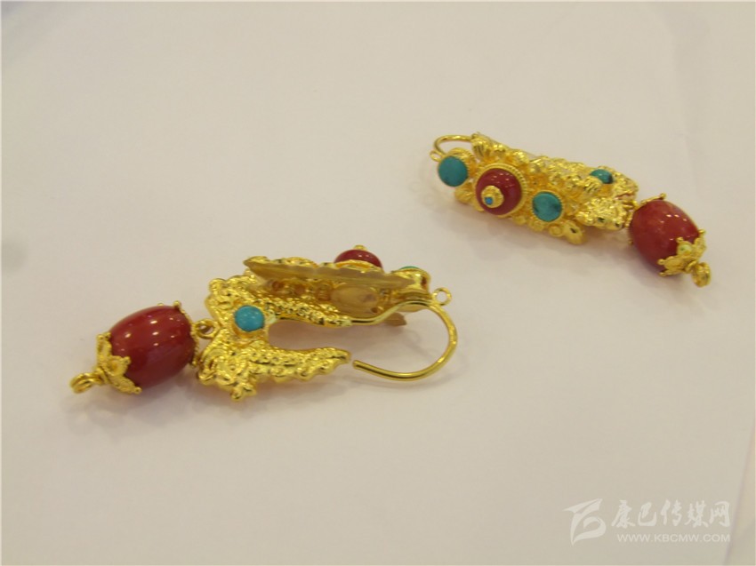 龍頭耳環(huán)在藏民族配飾歷史上較為久遠(yuǎn),設(shè)計師在遵循龍頭耳環(huán)傳統(tǒng)基礎(chǔ)上,結(jié)合當(dāng)下的潮流,用紅藍(lán)寶石做點綴,并在紅色寶石上打上精美的黃金花,很好的詮釋了個性與時尚的結(jié)合。