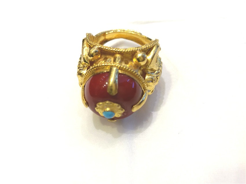 蜜蠟是藏家裝飾中的上成品,藏民族對蜜蠟的喜愛是非常誠懇的,表達(dá)著他們對大自然的無限崇敬之情與大自然饋贈的感謝之情。在他們看來,蜜蠟除了能夠作裝飾品佩戴、收藏之外,最引人注目的就是靈性修行之功效,設(shè)計師在此款戒指的設(shè)計上,緊扣藏民對蜜蠟的喜愛,并將漢式花邊與蜜蠟結(jié)合,是對藏漢文化交流較好的體現(xiàn)。