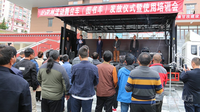 本網(wǎng)訊(記者 宋志勇 文/圖)6月22日,我州流動(dòng)舞臺(tái)車(chē)(圖書(shū)車(chē))發(fā)放儀式暨使用培訓(xùn)會(huì)在康定舉行,旨在為全州13個(gè)縣(市)及州歌舞團(tuán)、州圖書(shū)館統(tǒng)一配發(fā)流動(dòng)舞臺(tái)車(chē)、圖書(shū)車(chē),著力解決基層群眾看文藝演出難、看圖書(shū)難以及文藝表演團(tuán)體下鄉(xiāng)演出搭臺(tái)難、轉(zhuǎn)點(diǎn)難等實(shí)際困難,進(jìn)一步豐富基層農(nóng)牧民群眾文化生活。這是繼全國(guó)文化信息資源共享、鄉(xiāng)鎮(zhèn)綜合文化站建設(shè)實(shí)施的又一文化惠民工程。