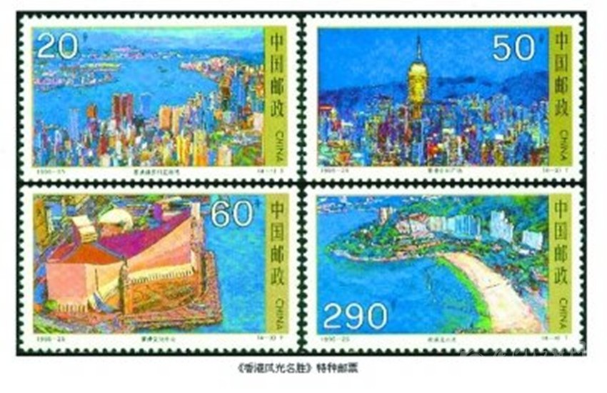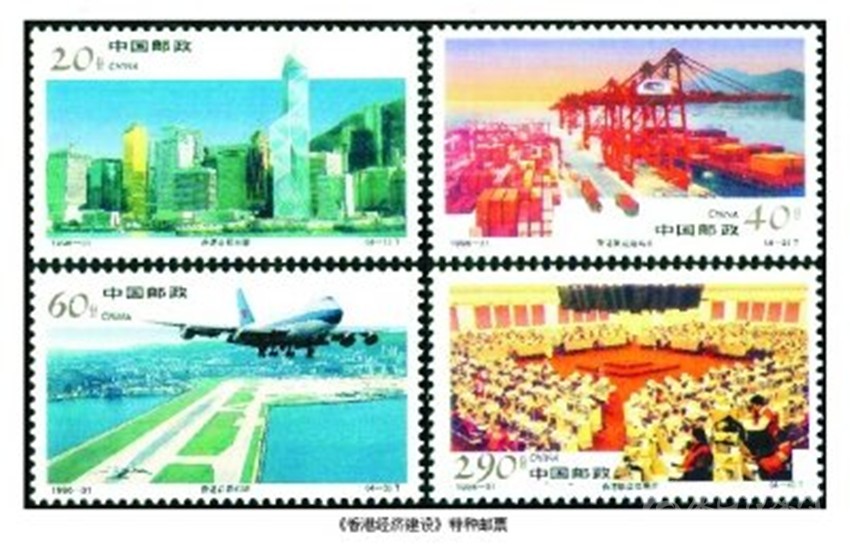 在香港回歸祖國(guó)的進(jìn)程中,為了讓全國(guó)和世界人民認(rèn)識(shí)香港,了解香港,我國(guó)相繼發(fā)行了兩套介紹香港風(fēng)光名勝和經(jīng)濟(jì)建設(shè)的特種郵票。1995年11月28日,我國(guó)發(fā)行《香港風(fēng)光名勝》特種郵票,全套4枚。圖案分別為“維多利亞港灣”“中環(huán)廣場(chǎng)”“文化中心”和“淺水灣”;1996年12月19日發(fā)行《香港經(jīng)濟(jì)建設(shè)》特種郵票,全套4枚。圖案分別為“香港中銀大廈”“香港集裝箱碼頭”“香港啟德機(jī)場(chǎng)”和“香港聯(lián)合交易所”。