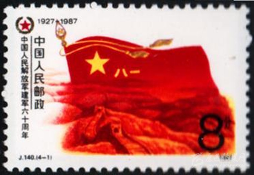 1977年8月1日原郵電部發(fā)行的《中國人民解放軍建軍50周年》紀(jì)念郵票,其中第4枚“雄師過大江”,圖案中一名沖在渡江隊伍前面的戰(zhàn)士高舉一面“八一”軍旗。1987年8月1日原郵電部發(fā)行的《中國人民解放軍建軍60周年》紀(jì)念郵票一套4枚。其中第1枚“軍魂”,郵票上一面鮮紅的“八一”軍旗迎風(fēng)飄揚,旗下是蜿蜒的萬里長城,代表了中國人民解放軍是保衛(wèi)祖國和人民的“鋼鐵長城”。1995年8月1日,原郵電部試發(fā)行一套“義務(wù)兵專用”郵票一套1枚,票名為“神圣的使命”,圖案以紅光四射的“八一”軍旗為背景,以現(xiàn)代化的飛機(jī)、坦克、火箭和象征和平的白鴿為襯托,畫面是威武的陸海空三軍,顯示我軍鋼鐵長城般攻無不克、戰(zhàn)無不勝的精神風(fēng)貌。