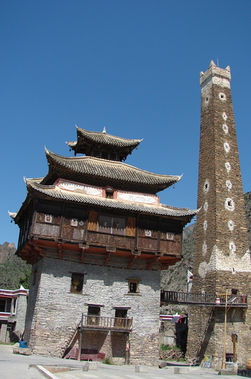 站在廣場中央仰望,碉樓有十五層高,約有二十余米,其外墻為片石壘砌,并附建有經(jīng)堂碉及過街樓,防御性極強。整座碉樓在修建中,層層收分,從墻面往上看,傾斜面在八十度左右。到達(dá)碉樓頂,面積只有四平米左右,在每一層樓里,都有外窄內(nèi)寬的窗戶,是典型的堡壘式射擊孔。在通往碉樓頂?shù)拿恳粚臃块g內(nèi),都有一根獨木梯連接著。第一層為石材壘筑的實心體,這種建筑方式為碉樓下大上小、重心向內(nèi)、穩(wěn)定性強的特點奠定了牢固的基礎(chǔ)。碉樓內(nèi),水源路網(wǎng)環(huán)環(huán)相通,倉儲空間很大。第二層為放置日常用品的地方,房門開在第三層,連接地面的依然是一根獨木梯,若遇敵人來犯時,人們便從獨木梯上攀援而上,再將獨木梯抽取。這樣,一座碉樓就固若金湯,只需從射擊孔中射出箭,或者從碉樓頂?shù)乃慕侨酉乱粔K塊巨石,不管敵人是如何的孔武有力,還是擁有如何的謀略,在碉樓面前都會束手無策,最后只能選取最原始的進攻方法——圍而不攻。坐待碉樓里的人彈盡糧絕之日,不過,人們在修建碉樓時,已充分的考慮了這些因素,在每一層樓里都儲備了足夠幾年之需的食物和水,這樣,往往是圍攻的人耐不住性子,最后只好悻悻然退卻。
