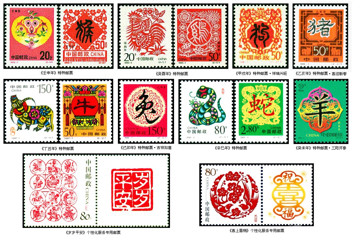 剪紙作為藝術(shù)百花園中的一朵奇葩,在我國(guó)郵票圖案設(shè)計(jì)中應(yīng)用也非常廣泛。由于傳統(tǒng)的民間剪紙有著濃郁的吉祥喜慶氣氛,因此在我國(guó)近些年發(fā)行的生肖郵票中多次出現(xiàn)剪紙藝術(shù)。在第二輪12套24枚生肖郵票中的剪紙圖案分別有1992年《壬申年》的“猴桃獻(xiàn)瑞”和“喜鵲登梅”、1993年《癸酉年》的“雄雞報(bào)曉”和“四季吉祥”、1994年《甲戌年》的第二枚“祥瑞興旺”、1995年的《乙亥年》的第二枚“喜迎新春”、1997年的《丁丑年》的“金牛奮蹄”和“牛耕年豐”、1999年《己卯年》的第二枚“吉祥如意”、 2001年《辛巳年》的“祥蛇祝?!焙汀跋檫\(yùn)普照”以及2003年的《癸未年》第二枚“三陽(yáng)開(kāi)泰”等。這些郵票中剪紙圖案有的直接取材于民間,有的則是在原作基礎(chǔ)上再創(chuàng)作。如“雄雞報(bào)曉”一枚,圖案選用的是河北省獻(xiàn)縣本齋鄉(xiāng)鄧家莊蔡蘭英老人的剪紙“百雞圖”中的一幅,而“金牛奮蹄”一枚,圖案是根據(jù)山東高密民間藝人齊秀花的剪紙“媳婦騎?!痹偌庸?chuàng)作而成的。在我國(guó)發(fā)行的祝福系列個(gè)性化服務(wù)專(zhuān)用郵票中也有吉祥喜慶的剪紙圖案,即2005年11月6日的《歲歲平安》和2005年11月11日的《喜上眉梢》等。