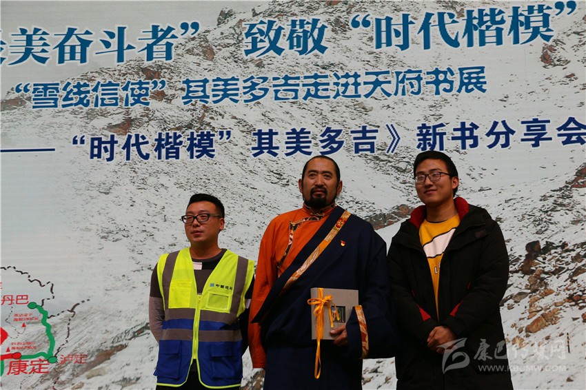 在分享會(huì)舞臺(tái)的一側(cè),靜置著書(shū)籍《雪線信使——“時(shí)代楷?!逼涿蓝嗉贩糯蠛蟮姆饷?。封面上,其美多吉、藍(lán)天與雪山相得益彰,構(gòu)成了一幅獨(dú)具特色的畫(huà)面。