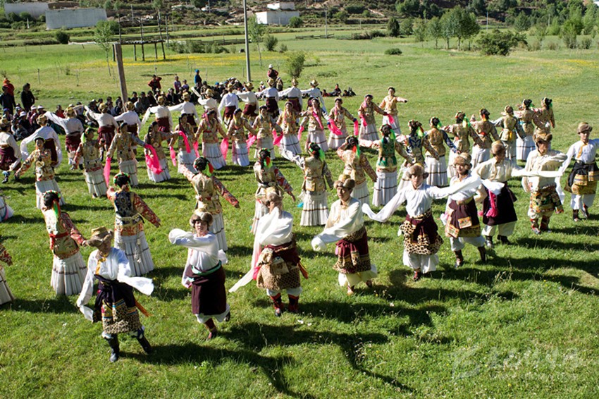 這當(dāng)中最具有依憑的觀點是:“學(xué)羌”是藏族傳說人物江根阿坡創(chuàng)作的,他綜合了康巴三江沿岸的鍋莊與踏歌的舞步,又融入了滇西北少數(shù)民族的一些舞蹈元素。從歷史上看,得榮瓦卡(茶馬古道金沙江碼頭)曾是茶馬古道上的一座重鎮(zhèn),各民族的馬幫和商人曾集聚在瓦卡碼頭。或許,人們常常在這里載歌載舞,久而久之,在碰撞和交流中慢慢融合出了一個新的舞蹈:學(xué)羌。