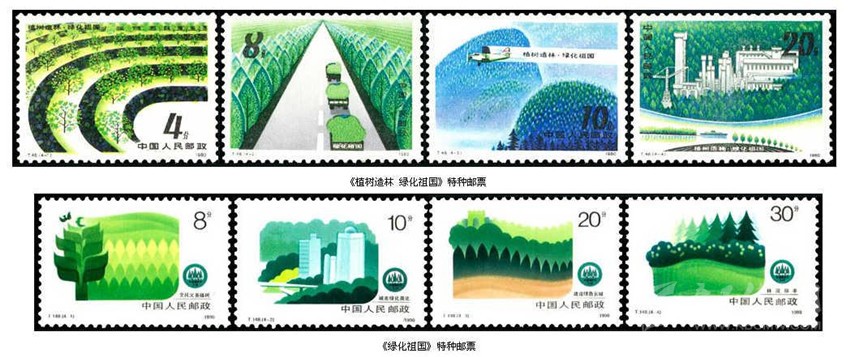 1980年3月12日,我國第一個(gè)植樹節(jié),中國郵政發(fā)行《植樹造林,綠化祖國》特種郵票,全套4枚。第一枚“經(jīng)濟(jì)林”,圖案是生長有序的梯田式的經(jīng)濟(jì)林林業(yè)基地。第二枚“四旁綠化”,即在宅旁、村旁、路旁和水旁因地制宜有計(jì)劃地種植經(jīng)濟(jì)林木以綠化城市、美化環(huán)境、護(hù)路護(hù)堤、凈化空氣以及為社會創(chuàng)造財(cái)富,圖中寬闊的道路兩旁綠油油的樹令人心情舒暢。第三枚“飛播造林”,圖案是在翠綠的群山間一架飛機(jī)正在向山嶺撒播樹種進(jìn)行造林,在飛機(jī)拉出的煙霧中有“植樹造林,綠化祖國”八個(gè)字,體現(xiàn)了我國植樹造林走全民動員和現(xiàn)代化的道路。第四枚“廠礦綠化”,廠礦置于一片綠色海洋之中,形成了美麗的園林化廠區(qū)。