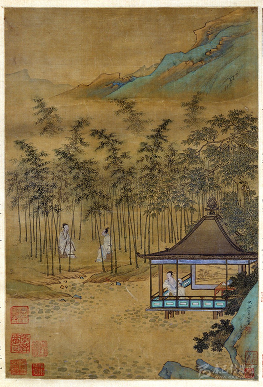 此圖意境極像唐代詩(shī)人王維的藍(lán)田山別墅。這里林木茂密,山澗淙淙,館舍、房屋散布其間,每到夏季,山風(fēng)習(xí)習(xí),涼爽怡人,王維和文友們?cè)诖硕认谋苁?,垂釣飲酒,談?wù)撛?shī)文,修身養(yǎng)性,過(guò)著悠閑自在的隱居生活。他在《竹里館》一詩(shī)里寫過(guò)自己的隱居快樂(lè)感受:“獨(dú)坐幽篁里,彈琴?gòu)?fù)長(zhǎng)嘯。深林人不知,明月來(lái)相照?!比?shī)格調(diào)幽靜閑遠(yuǎn),仿佛詩(shī)人的心境與自然的景致全部融為一體了。宋朝詩(shī)人楊萬(wàn)里喜歡在皎潔的月光之下,清輝孤影,來(lái)到搖曳的竹林中,聽(tīng)著夏夜里悅耳的蟲鳴,夜深氣清,盡管沒(méi)有涼風(fēng)送爽,但是悶熱暑氣頓時(shí)消失,于是他寫了一首《夏夜追涼》詩(shī):“夜熱依然午熱同,開門小立月明中。竹深樹密蟲鳴處,時(shí)有微涼不是風(fēng)。”