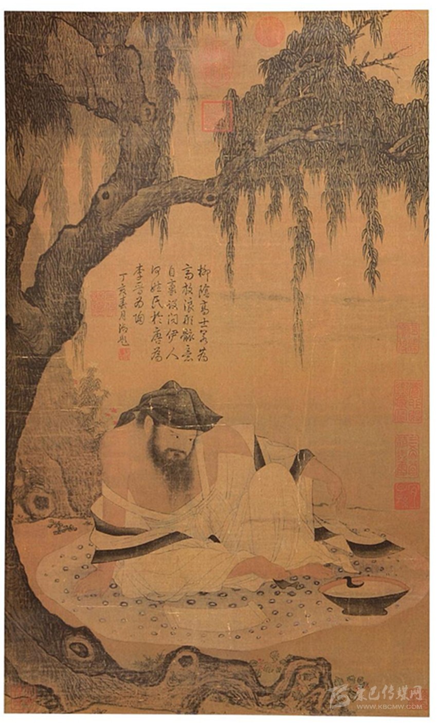 陶淵明曾說(shuō):“夏月虛閑,高臥北窗之下,清風(fēng)颯至,自謂羲皇上人。”一個(gè)高人隱士酒后高臥草廬窗下,悠閑自得乘涼的形象躍然紙上。唐代詩(shī)人李白非常向往陶淵明恬淡閑逸、與世無(wú)爭(zhēng)、天人合一的隱逸生活,寫詩(shī)曰:“陶令日日醉,不知五柳春。素琴本無(wú)弦,漉酒用葛巾。清風(fēng)北窗下,自謂羲皇人。何時(shí)到栗里,一見(jiàn)平生親。”表達(dá)了對(duì)陶淵明人品和理想的仰慕之情?,F(xiàn)藏于臺(tái)北故宮博物院的宋人《柳蔭高士圖》即是此意境。據(jù)《石渠寶笈》記載,此圖為素絹本著色畫,左方下有孫承澤印,右方下有北平孫氏印,左邊幅有棠村審定、蕉林二印。只知為宋人之作,相關(guān)的背景則無(wú)從查考。畫中為一棵古柳樹,樹干虬曲剛勁,枝葉繁茂。樹下一翁,美髯飄忽,袒胸露腹,頭戴葛巾,赤足席地而坐。坐前有一幅展開的手卷,酒樽滿盈,淺斟低酌。表面上看此翁雙目聚神,凝視手卷,實(shí)則已是眼餳耳熱,醺醺然不勝桮杓。清乾隆皇帝對(duì)《柳蔭高士圖》十分喜愛(ài)欣賞,在畫上御筆題詩(shī)云:“柳蔭高士若為高,放浪形骸意自豪。設(shè)問(wèn)伊人何姓氏,于唐為李晉為陶?!鼻〉壅f(shuō),這位高士如是唐人就是李白,如是晉人便是陶淵明。但是從服飾和環(huán)境看,應(yīng)是五柳先生陶潛也。這幅圖所表現(xiàn)的就是“心靜自然涼”。