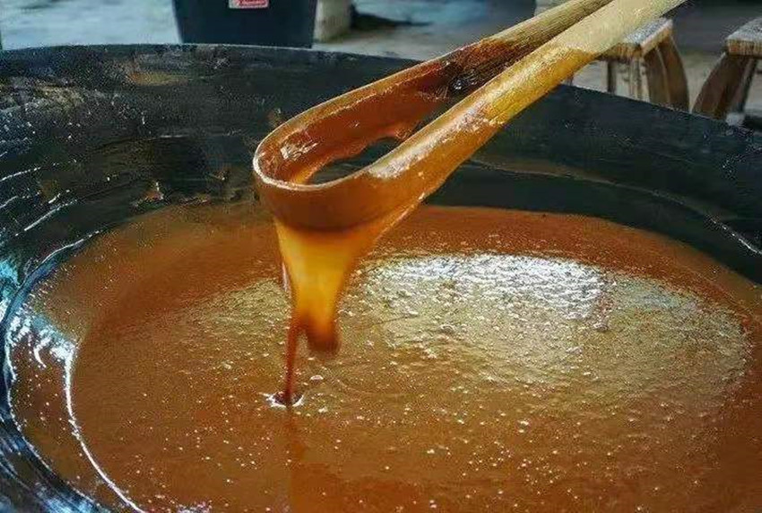 姐姐做好了午飯,我也完成了燒火任務(wù)。母親退掉了灶里燃燒的柴火,留下猩紅的火炭,將一瓢早已準(zhǔn)備好的麥芽漿倒入煮好的漿糊中,加水?dāng)嚢杈鶆蚝箪o置。直到吃完午飯,我們即將出發(fā)去大伯家時,我看到鍋里的漿糊上面析出一層透明的液體。此時母親又點燃了灶火繼續(xù)熬煮兩鍋漿糊,煮開后進(jìn)行過濾。再將濾出的糖水倒入洗凈的大鍋中熬煮。