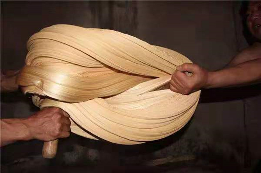 扯糖也是熬糖過程中十分關(guān)鍵的一個環(huán)節(jié)。剛出鍋的糖溫度可達(dá)兩三百度,徒手是不敢去觸碰的,扯糖需等到麻糖變得溫?zé)岵拍苓M(jìn)行,但又必須在它完全冷卻之前完成整個扯糖工序,否則等麻糖徹底冷卻就會變得僵硬無比。休息少頃,只見三叔熟練的用粘著面粉的手從盛放麻糖的簸箕中扯下三四斤左右的一團(tuán)麻糖,左手拿糖右手持杖(類似于搟面杖的木棍)作出扯糖的姿勢,此時四叔拿著早已準(zhǔn)備好的沾了面粉的木棍將三叔的手中的麻糖攔腰別住,用力均勻的拉扯麻糖,三叔則在原地扎樁站穩(wěn),一手持杖作拉扯狀,一手微微扶住想要往下掉的糖尾,經(jīng)過幾次折疊和來回拉扯,麻糖變得均勻細(xì)長,兩人合力將扯好的麻糖平穩(wěn)的放在鋪有熟面粉的大簸箕中靜待冷卻。間隙二叔和父親又重復(fù)著扯糖的動作,很快將一團(tuán)糖餅扯成糖帶。經(jīng)過拉扯后麻糖中間會形成很多的空洞,吃起來酥脆香甜。