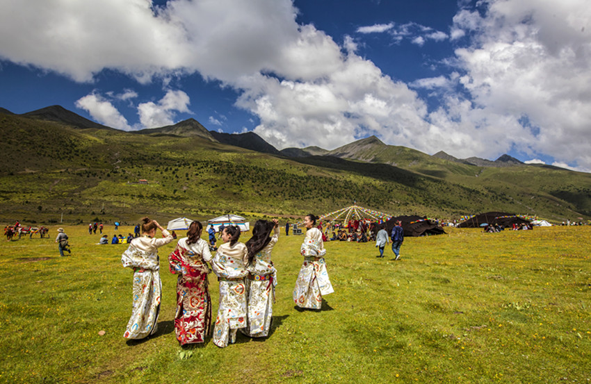 一片翡翠般的碧湖鑲嵌在谷地中央。公主梳妝的寶鏡,將美人、美景、美的念想都映在水里。九灣十八拐的“俄米曲”(牛奶河)是谷地和牛羊的母親。一溝豐盛的水草,滋潤(rùn)了多少木雅兒女!木雅花宮、花海尋蹤,公主嘉姆尊的身影隨處可見。