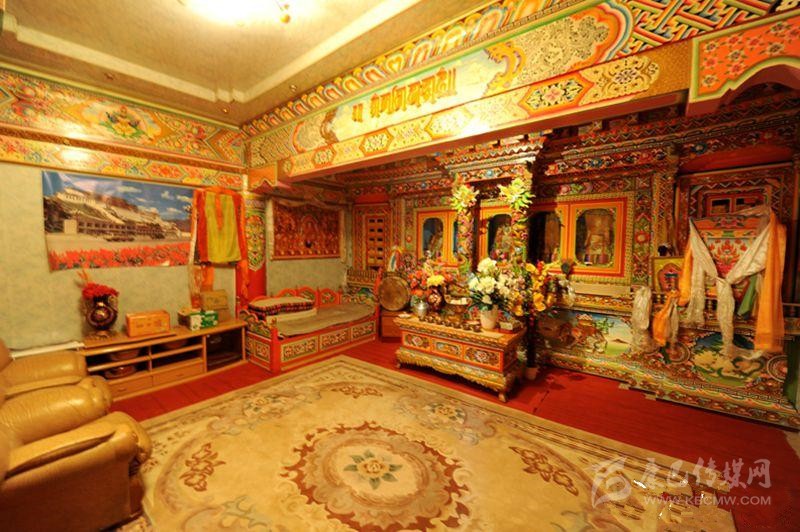 藏族居室一般分臥室、客廳、經(jīng)堂和廚房等部分。室內(nèi)陳設(shè)與裝飾如藏式建筑學(xué)者葉啟燊所言:“主次分明,重點(diǎn)突出。主室較為復(fù)雜而樸素,經(jīng)堂偏于華麗而清幽,其余各室均較簡單。室內(nèi)都不施粉刷,但有個(gè)別的經(jīng)堂作雕刻裝飾;土司和喇嘛上層的經(jīng)堂則會(huì)作油漆的彩畫?!辈貐^(qū)不論是農(nóng)牧民住宅還是貴族上層府邸都有供佛的設(shè)施,經(jīng)堂屬于凈地,是專門供奉神佛的,因此,一般不作他用;主室是藏族住宅中最重要的一個(gè)房間,也是功能最多的房間,其中有生活、睡眠、飲食等所需的爐灶、壁櫥、壁架、矮桌、火盆等。這些藏式家具的布置安放,早已形成一定之規(guī)。