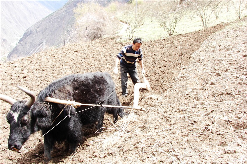 在春播這天,男女老少都穿上節(jié)日的盛裝。給每一頭耕牛的角抹上了油,在陽(yáng)光的照耀下發(fā)出逼人的寒光,牛的頸上,系著一根雪白的哈達(dá),犁鏵也被擦拭得锃光瓦亮的,“架單”(用紅樺做成,成彎曲狀)架在牛的頸上,牛肋兩邊,兩條粗如兒臂的繩索連接著“架單”和犁頭,耕地的男人們將犁鏵插進(jìn)地里,等待儀式的開始。