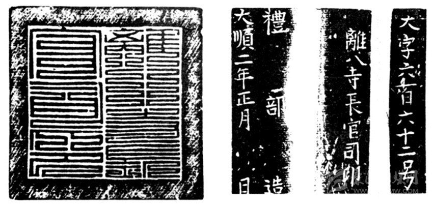 “離八寺官司印”為大西政權官印,大順二年(1645)鎏金銅制九疊篆印章。高約6CM, 規(guī)格7×7,印章正面邊款鑄文“大字六百六十二號 離八寺長官司印”,側刻“禮部造 大順二年正月 日”,評為國家一級文物。史書載:“獻忠遍招諸土司,用降人為誘,鑄金印赍之,以易其官?!币虼丝赏茢?,此印為大西政權控制川西少數民族所鑄。