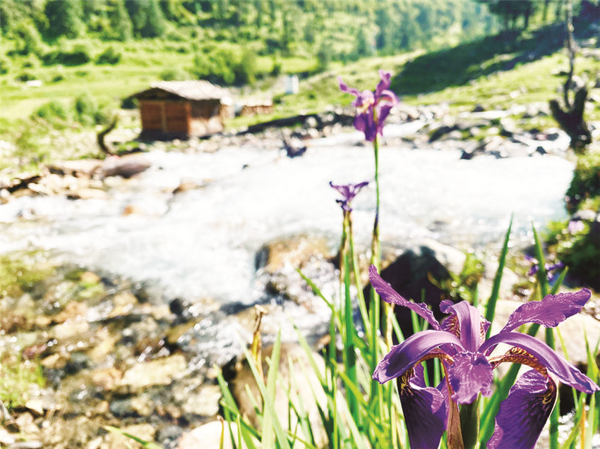 我走出木屋,朝著流動(dòng)的水聲去梳洗。三兩只藍(lán)綠色的鳥兒立在插入溪水溝里的一截木槽上低頭飲水,抬頭鳴唱,見到人影,撲棱棱幾聲飛進(jìn)了不遠(yuǎn)處的一片淺樹叢里,沒(méi)了蹤跡。一層薄薄的白霧正從牧場(chǎng)后方皺褶起伏的山頂漫溢下來(lái),湮沒(méi)了黛青色的山石、綠色的小杜鵑樹叢,接著湮沒(méi)了整個(gè)牧場(chǎng),眼前一片空茫,耳邊只有溪水婉轉(zhuǎn)流向遠(yuǎn)處的聲音。我蹲下身,把手伸進(jìn)溪水里,由雪水融化的沁涼很快冷冽到了骨頭里,再往深處,觸摸到一個(gè)個(gè)光滑的圓石。浸泡久了,溪水開始變得柔軟溫暖起來(lái),掬一捧洗臉,那清爽仿佛能使我一眼看開眼前的云霧,看清那些停立于山頂石礫之上的灰色獐子和樹叢深處悄然綻開的紫色貝母花,花瓣上星星點(diǎn)點(diǎn)的白是它與生俱來(lái)的喜色。