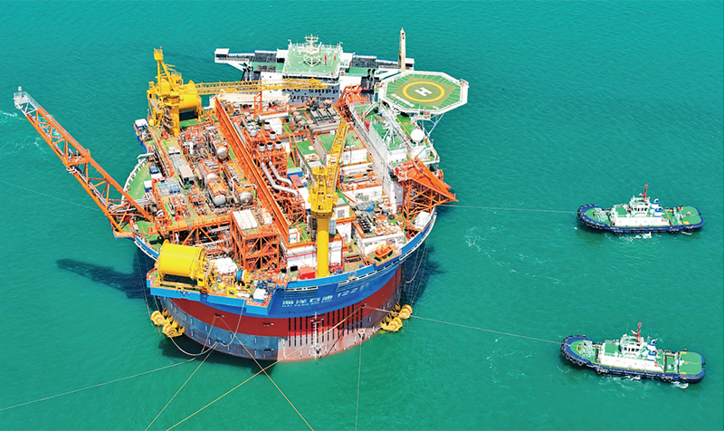 “??惶枴?,是亞洲首艘圓筒型浮式生產儲卸油裝置。該裝置集原油生產、存儲、外輸?shù)裙δ苡谝惑w,被網友們昵稱為“超級能源碗”,也是完全由我國自主設計建造的海上油氣加工廠。圖為2024年5月12日,“海葵一號”從中國海油青島國際化高端裝備制造基地離港啟運。 人民圖片 張進剛/攝