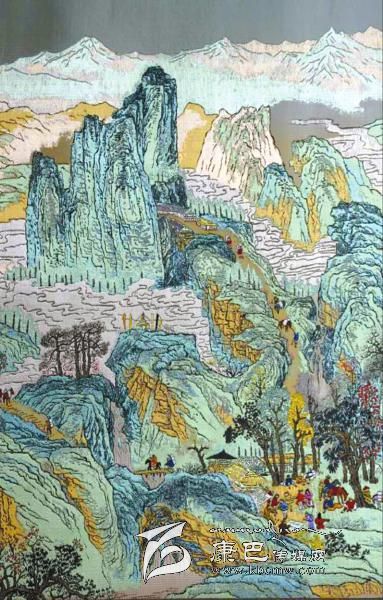 在蜀錦蜀繡展覽館中,由蜀錦大師馬德坤,蜀繡大師鄔學(xué)強(qiáng)共同創(chuàng)作大型錦繡作品《南方絲路圖》,吸引不少游客駐足。該作品天空部分的藍(lán)色由深及淺,并逐步過渡到表現(xiàn)地面的泥金色。同時,利用絲織品的透光性,使遠(yuǎn)山和近景形成強(qiáng)烈對比,大大地增強(qiáng)了畫面的縱深感。