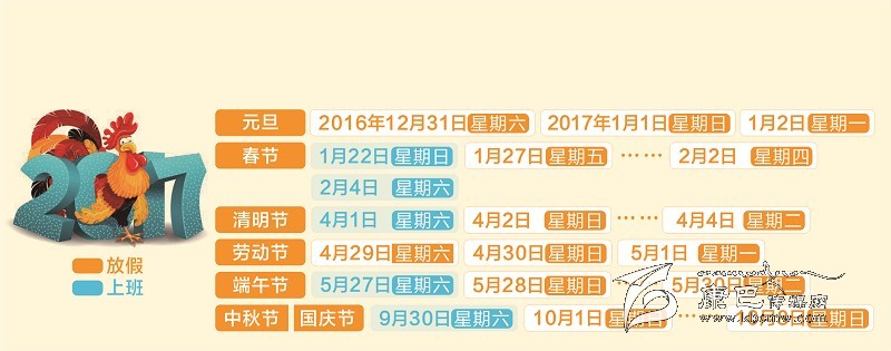 經(jīng)國務(wù)院批準,現(xiàn)將2017年元旦、春節(jié)、清明節(jié)、勞動節(jié)、端午節(jié)、中秋節(jié)和國慶節(jié)放假調(diào)休日期的具體安排通知如下。