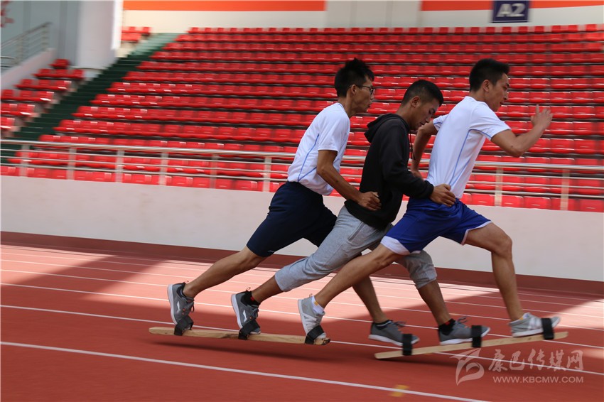 “啪,啪,啪……”,在高腳競(jìng)速訓(xùn)練場(chǎng)地的對(duì)面,板拍打地面的聲音有節(jié)奏地在賽道上回蕩著。記者看到4組板鞋競(jìng)速隊(duì)正在有序訓(xùn)練,每隊(duì)有三名運(yùn)動(dòng)員,他們都把腳套在一個(gè)木板鞋上,后面的兩個(gè)運(yùn)動(dòng)員把手放在前一個(gè)運(yùn)動(dòng)員的腰上,三個(gè)人齊心協(xié)力,喊著有節(jié)奏的口號(hào),彼此邁著統(tǒng)一的步伐為了共同的目標(biāo)而前進(jìn)。每一組的隊(duì)員都是齊心協(xié)力,好像他們已然融為一體,步伐的頻率和擺臂的頻率都是一致的,絲毫沒有違和感。
