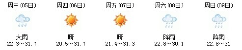 雖然明天太陽有點兇,但7日、8日、9日三天陣雨及時出現(xiàn),日最高氣溫穩(wěn)定在30℃附近。