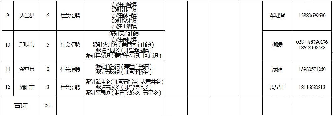 1﹒社會(huì)招聘招募區(qū)(市)縣:成都天府新區(qū)、新都區(qū)、郫都區(qū)、簡(jiǎn)陽(yáng)市、都江堰市、彭州市、邛崍市、崇州市、金堂縣、新津縣、大邑縣、蒲江縣(具體信息詳見(jiàn)附件1)。