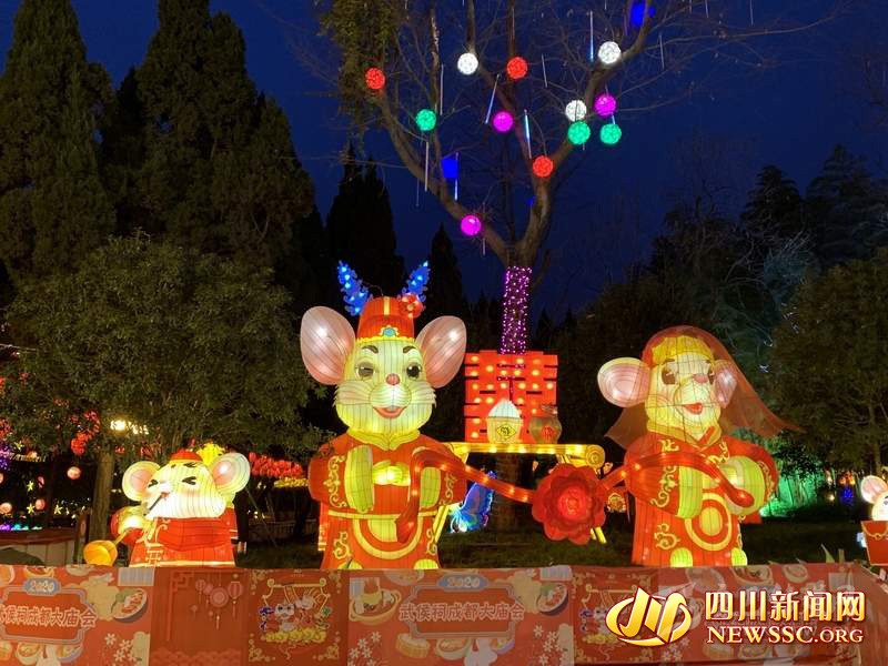 據(jù)成都武侯祠博物館工作人員介紹,“2020武侯祠成都大廟會”對燈組景觀和光影效果進(jìn)行了全面升級,正門燈組主架構(gòu)以漢闕風(fēng)格和傳統(tǒng)吉祥圖案為基本元素,中為成都傳統(tǒng)民俗IP喜神主題的諸葛亮形象,兩側(cè)為兩只活潑可愛的生肖鼠,為游客送上“吉祥如意”和“鼠年大吉”的祝福。西區(qū)廣場和軸線兩大燈組分別以“喜神送寶”和“魅力天府”為主題,將生肖鼠和紅包、祥云、銀杏等吉祥元素相結(jié)合,營造溫馨、浪漫和喜慶的節(jié)日氛圍,呈現(xiàn)出吉慶祥和、物豐民富、前程似錦的魅力天府景象。西區(qū)湖面“三顧草廬”大型燈組長寬均達(dá)50米,高度超過20米,為歷屆廟會之最,形象上以大型彩燈描繪歷史故事,展示武侯祠作為“三國圣地”的厚重歷史底蘊(yùn),配合蓮花、仙鶴、祥云、福樹等點綴和流水追光,將宏大敘事和細(xì)節(jié)裝飾完美融合。