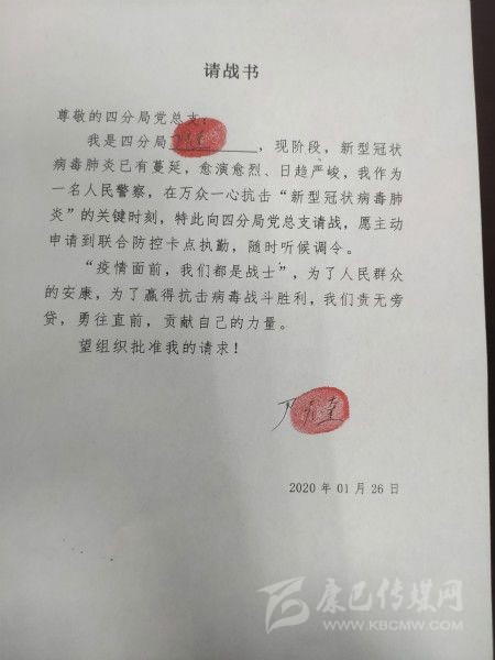 四川新聞網(wǎng)成都1月31日訊(記者 文驥 攝影報道) “疫情面前,我們都是戰(zhàn)士,為了人民群眾的安康,為了贏得抗擊病毒戰(zhàn)斗勝利,我們責(zé)無旁貸……”尹彥奎是成都交警四分局的一名黨員交警,1月26日,他向分局黨總支遞交了一份請戰(zhàn)書,還按上了手印。
